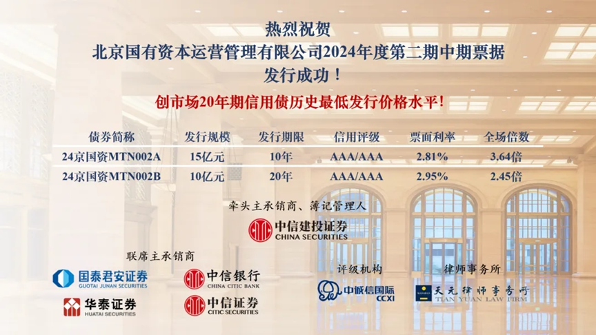 3月14-15日,北京國管成功發行(xíng)2024年第二期中期票(piào)據,總規模25億元,采用雙期限品種回撥發行(xíng)方式。其中,10年期債券發行(xíng)規模15億元,票(piào)面利率2.81%,為(wèi)同期較好價格水(shuǐ)平;20年期債券發行(xíng)規模10億元,票(piào)面利率2.95%,創市場(chǎng)曆史同期限信用債票(piào)面利率新低(dī)。
